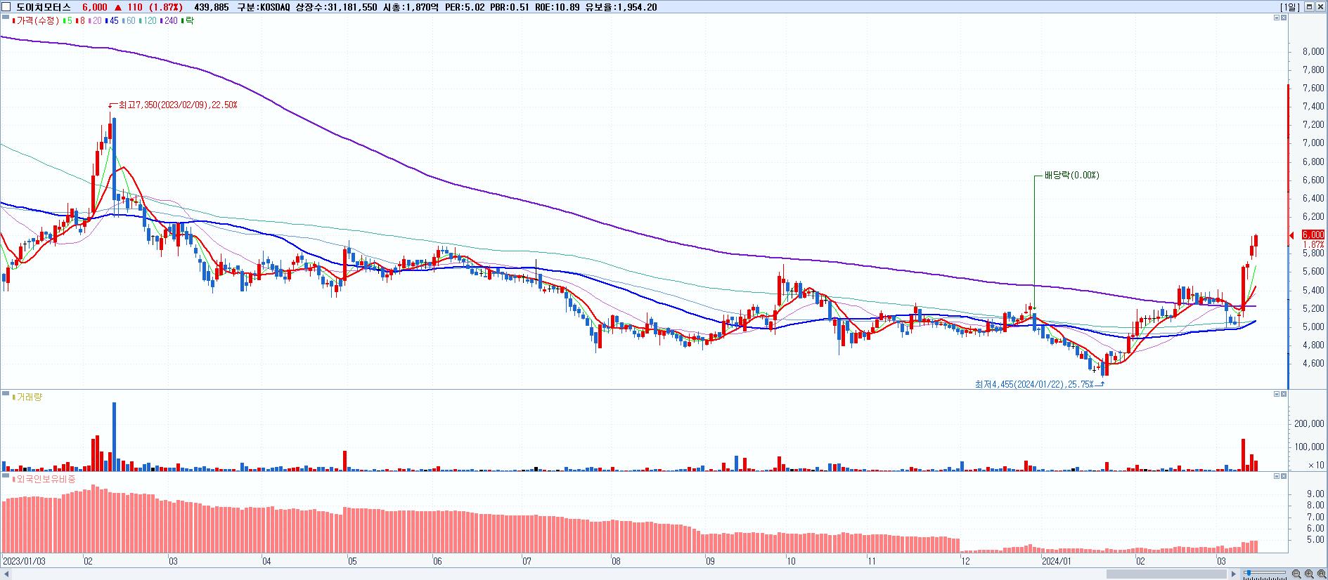 - 도이치모터스 (6,000원 ▲ 1.87% , 시총: 1,871억, 거래량: 439,885, 거래대금:26억, KOSDAQ)