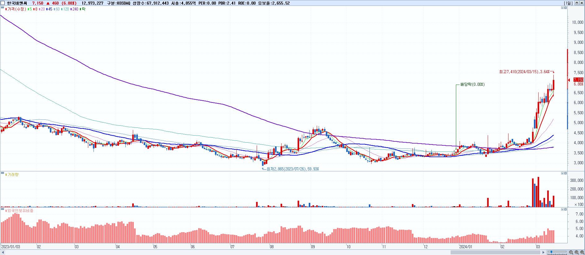 - 한국비엔씨 (7,150원 ▲ 6.88% , 시총: 4,856억, 거래량: 12,975,349, 거래대금:920억, KOSDAQ)