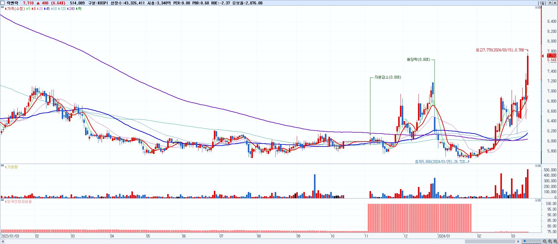 - 락앤락 (7,710원 ▲ 6.64% , 시총: 3,340억, 거래량: 514,089, 거래대금:39억, KOSPI)