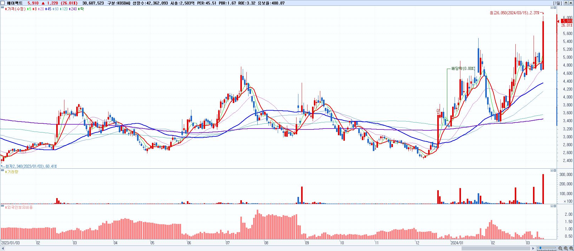 에이팩트 5,910원 ▲ 26.01% (KOSDAQ, 200470)
