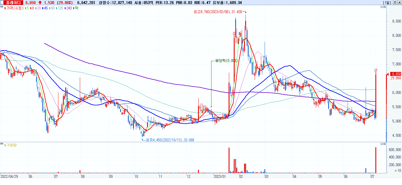 시총: 853억 거래량: 6,643,214 거래대금:410억