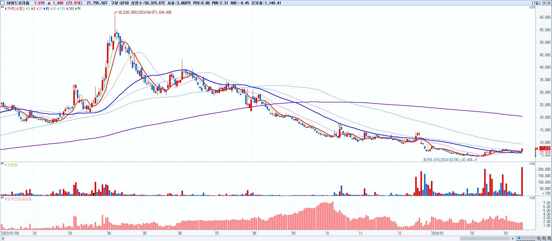 - 하이드로리튬 (7,670원 ▲ 23.91% , 시총: 3,860억, 거래량: 21,795,567, 거래대금:1,601억)