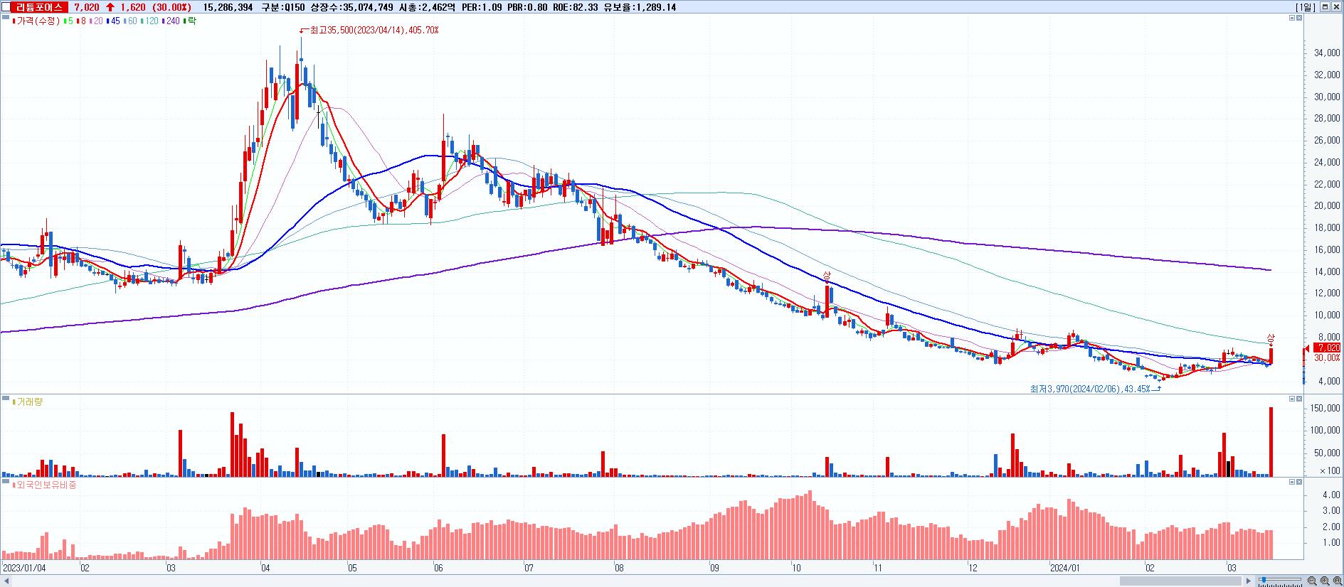 - 리튬포어스 (7,020원 ▲ 30% , 시총: 2,462억, 거래량: 15,286,394, 거래대금:1,027억)