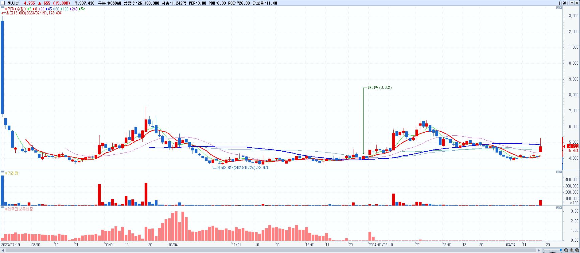 - 센서뷰 (4,755원 ▲ 15.98% , 시총: 1,242억, 거래량: 7,987,436, 거래대금:396억)
