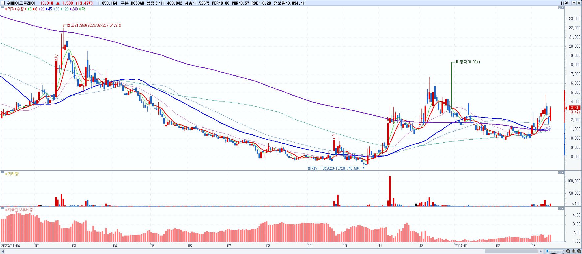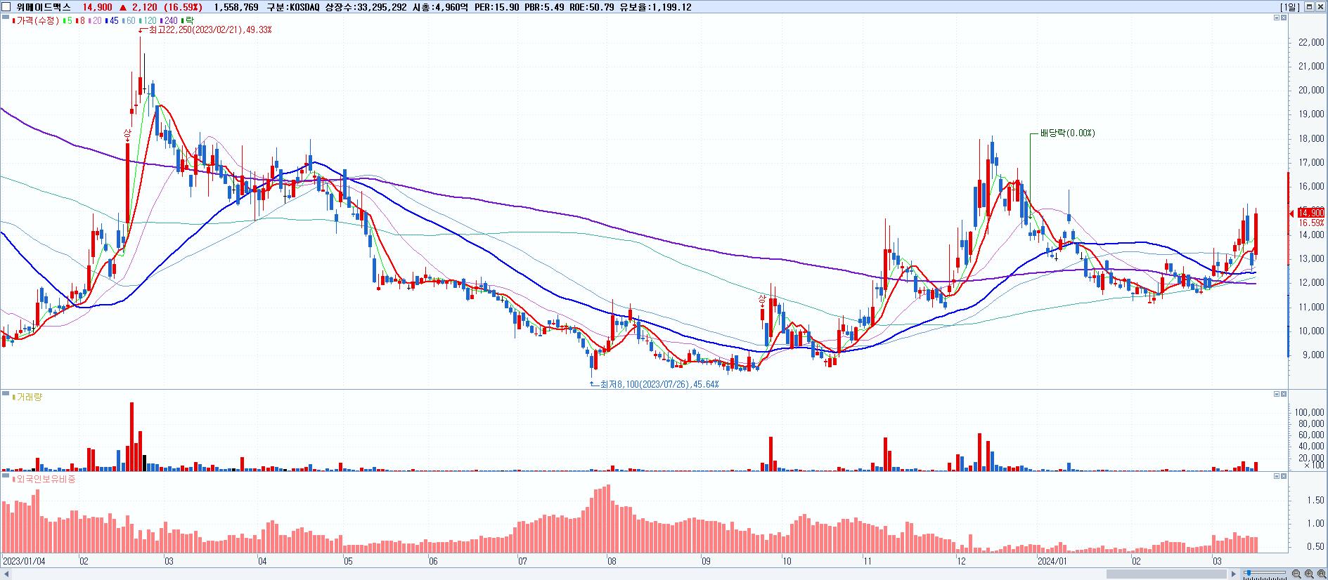 - 위메이드 (69,500원 ▲ 23.67% , 시총: 23,559억, 거래량: 5,409,841, 거래대금:3,490억)
