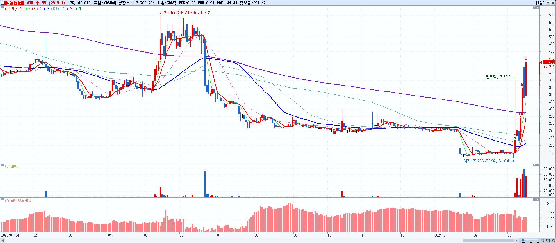 시총: 506억 거래량: 76,182,848 거래대금:305억