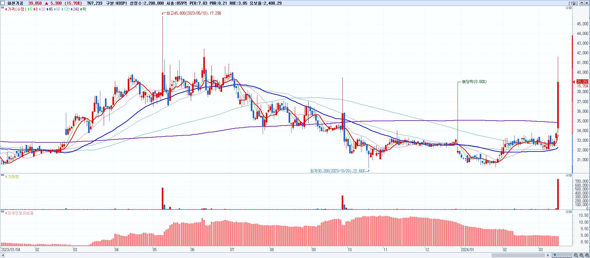 - 화천기공 (39,050원 ▲ 15.7% , 시총: 859억, 거래량: 767,233, 거래대금:300억)