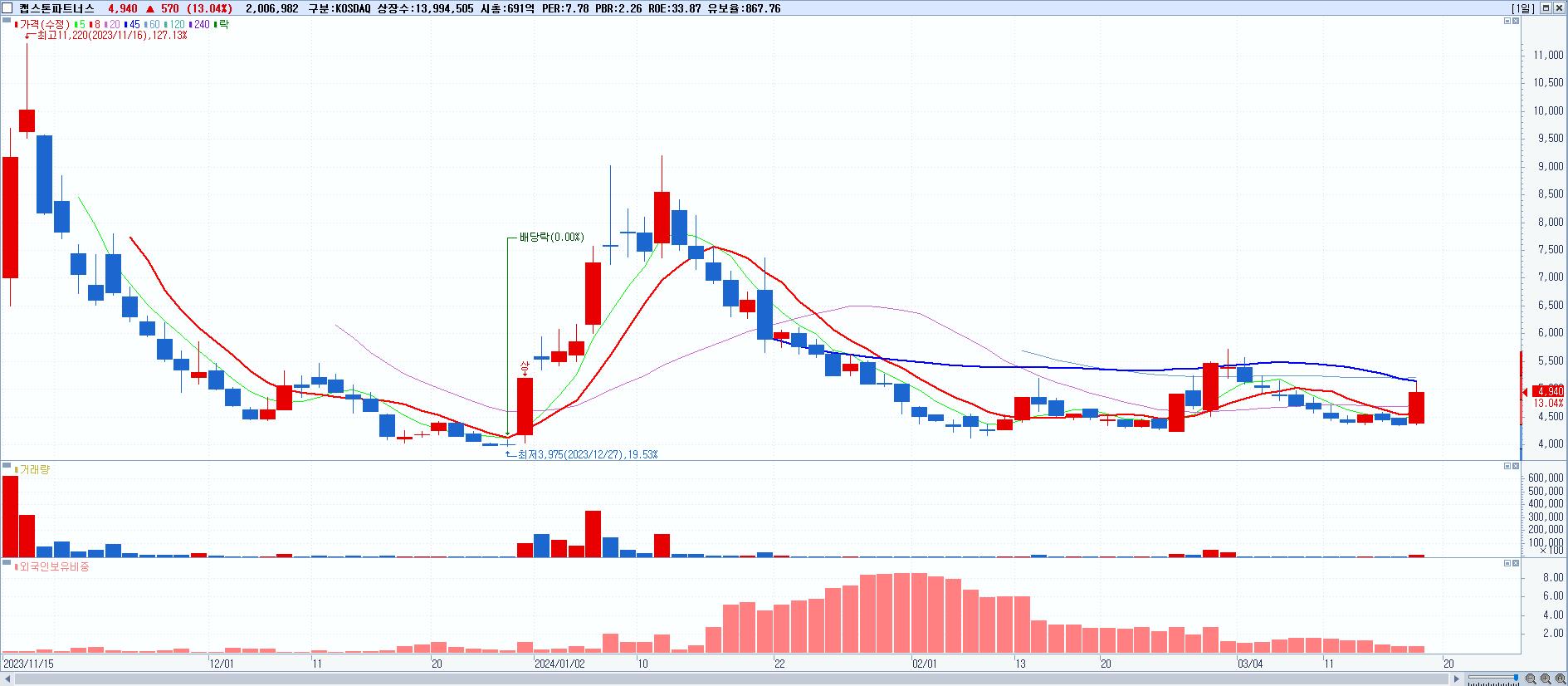 시총: 2,494억 거래량: 14,776,424 거래대금:280억