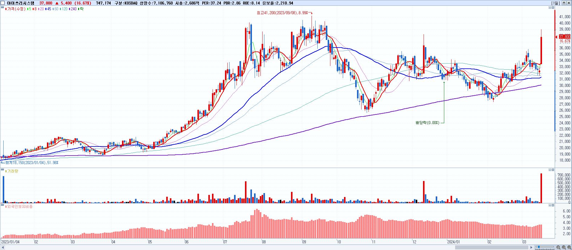- 아이쓰리시스템 (37,800원 ▲ 16.67% , 시총: 2,686억, 거래량: 766,174, 거래대금:285억)