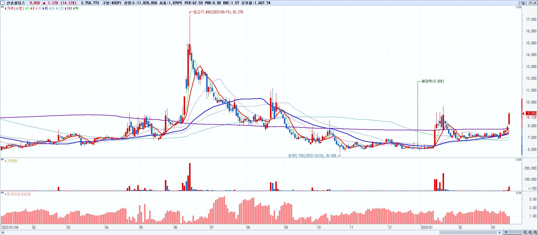 - 신송홀딩스 (9,050원 ▲ 14.12% , 시총: 1,071억, 거래량: 3,758,773, 거래대금:330억)