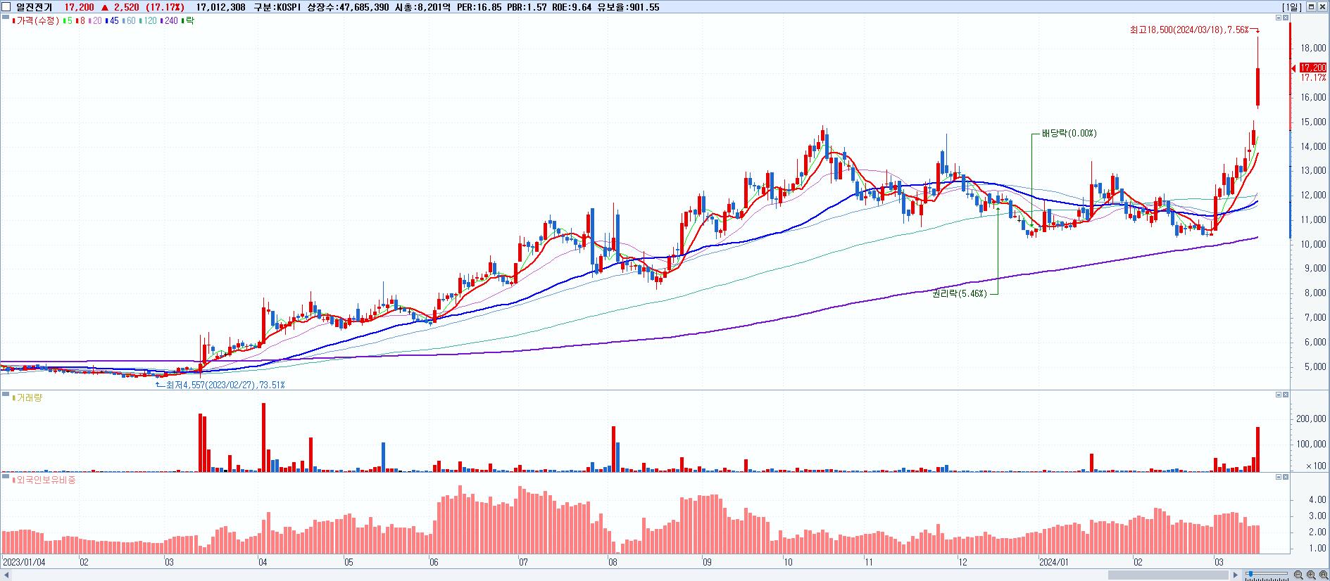 - 일진전기 (17,200원 ▲ 17.17% , 시총: 8,202억, 거래량: 17,012,308, 거래대금:2,928억)