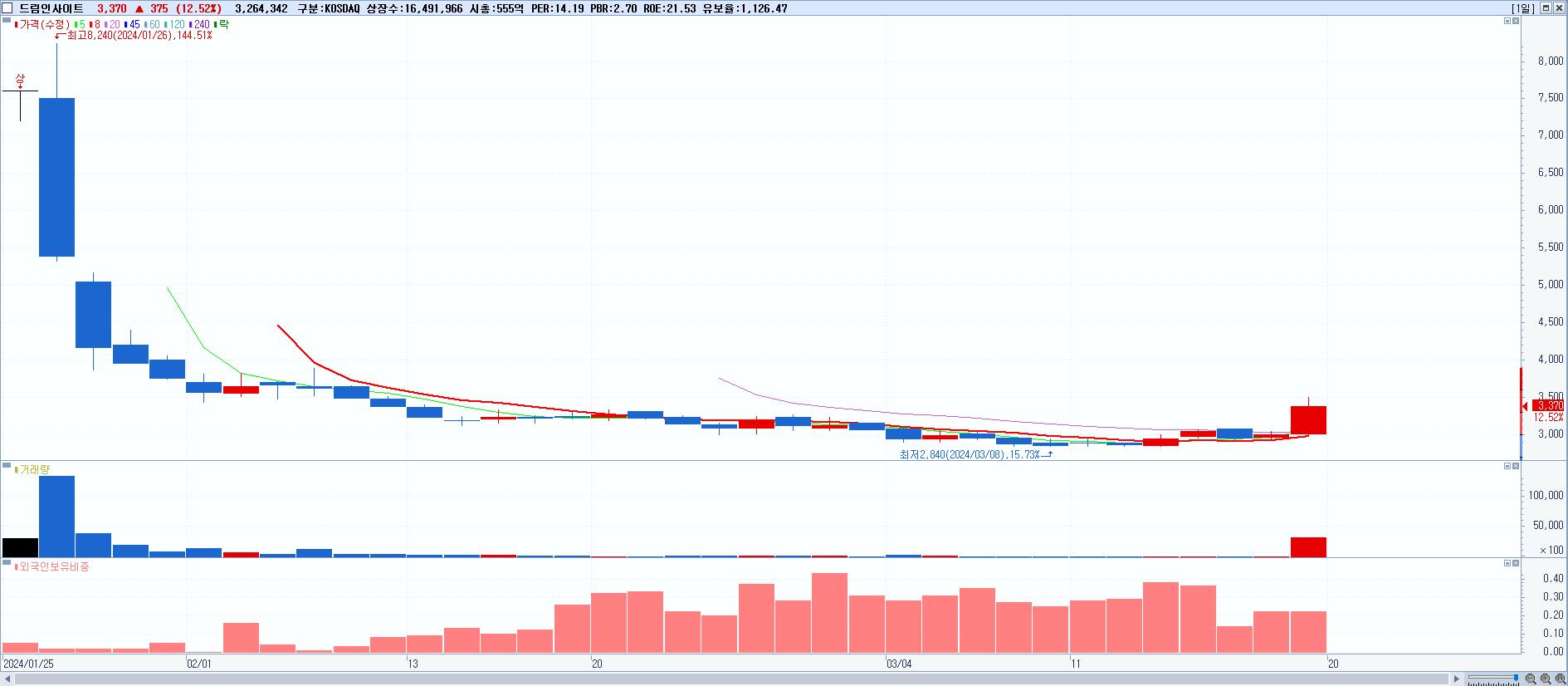- 드림인사이트 (3,370원 ▲ 12.52% , 시총: 556억, 거래량: 3,264,342, 거래대금:110억)