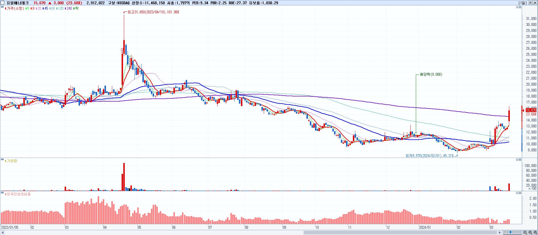 - 유일에너테크 (15,670원 ▲ 23.68% , 시총: 1,797억, 거래량: 2,912,022, 거래대금:453억)