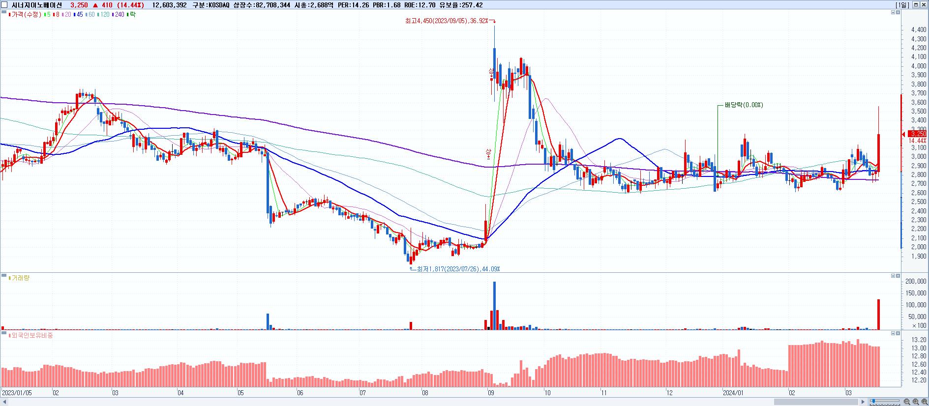 - 시너지이노베이션 (3,250원 ▲ 14.44% , 시총: 2,688억, 거래량: 12,603,392, 거래대금:418억)