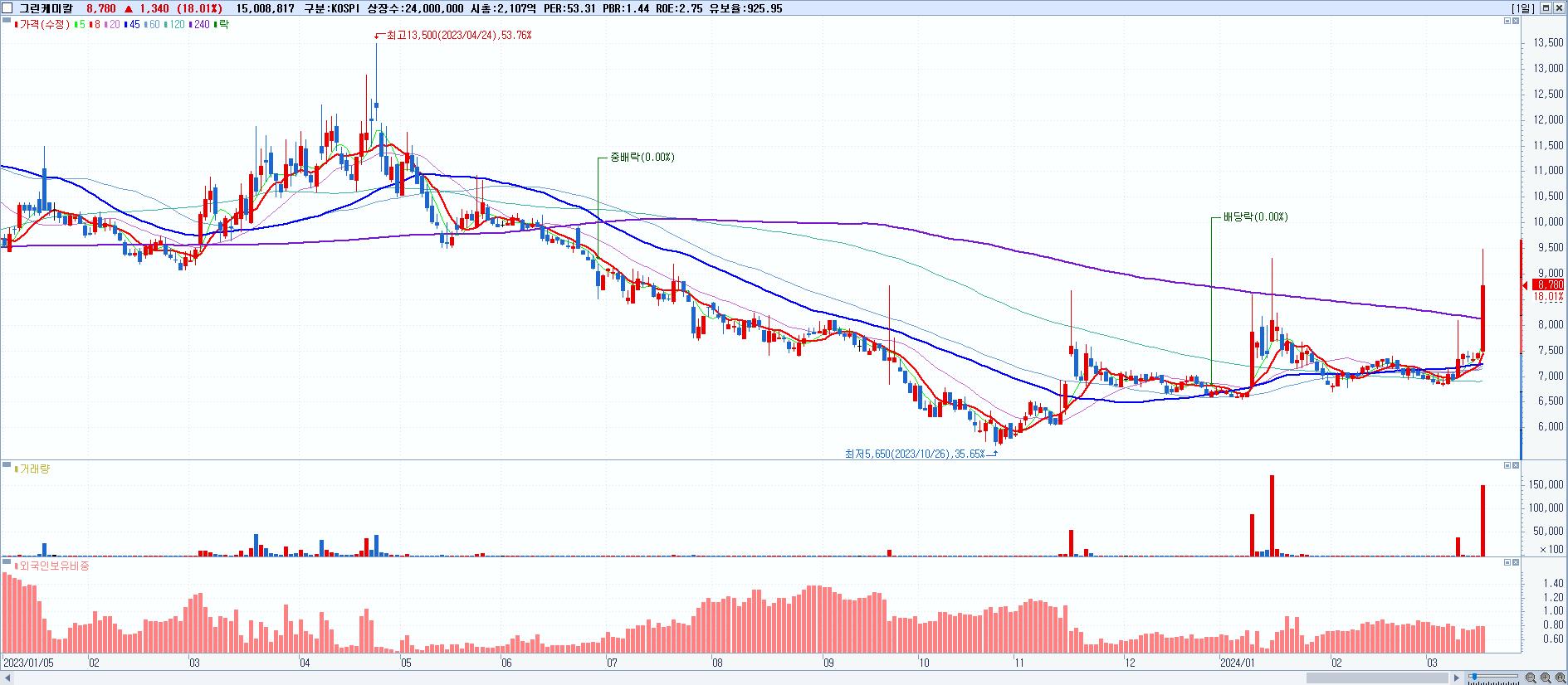 - 그린케미칼 (8,780원 ▲ 18.01% , 시총: 2,107억, 거래량: 15,008,817, 거래대금:1,316억)