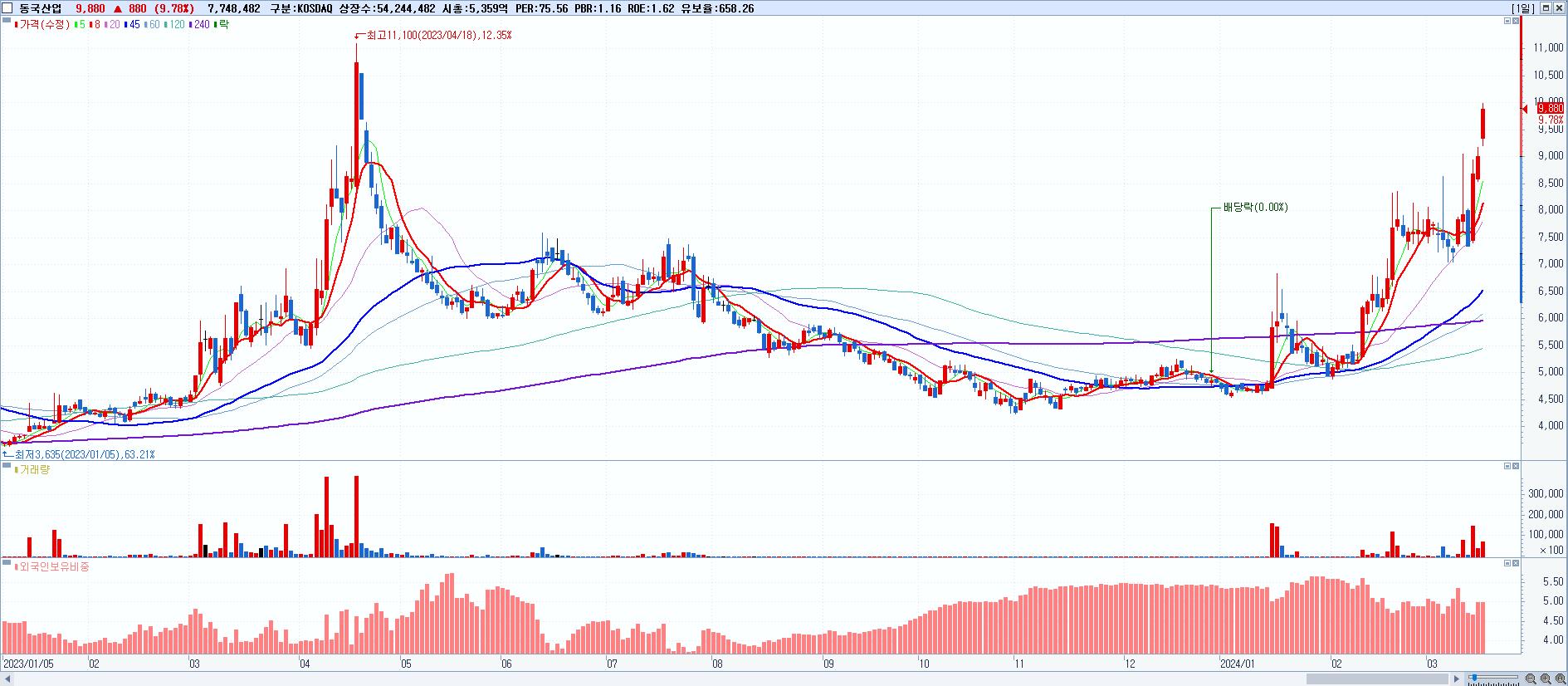 - 동국산업 (9,880원 ▲ 9.78% , 시총: 5,359억, 거래량: 7,748,482, 거래대금:750억)