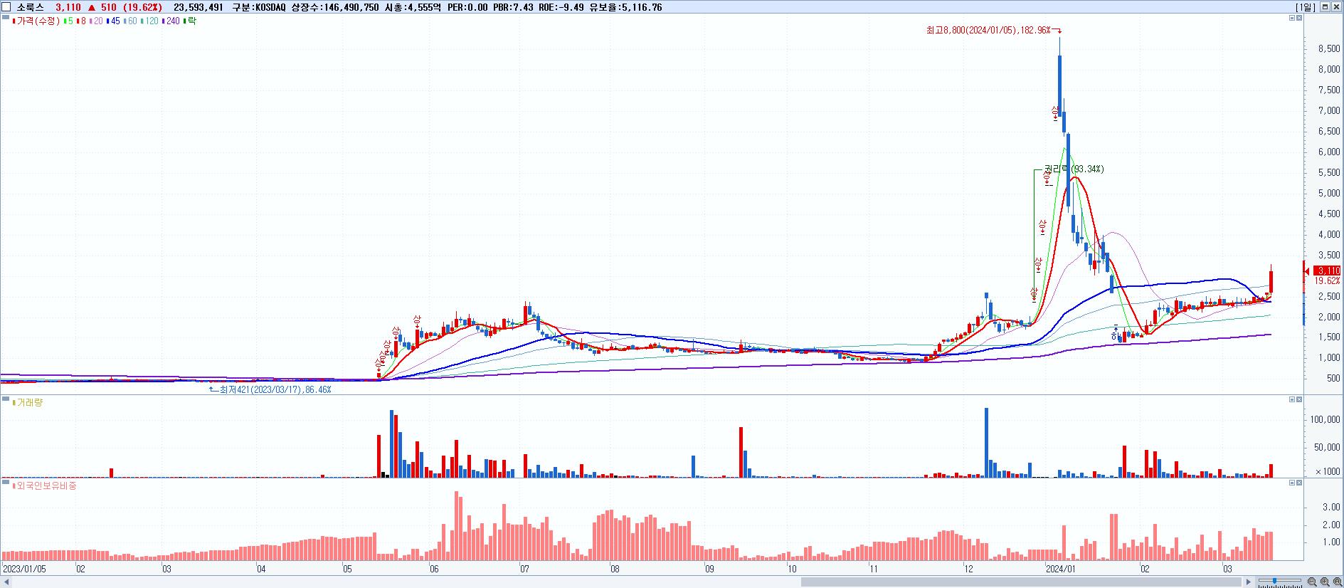 - 소룩스 (3,110원 ▲ 19.62% , 시총: 4,556억, 거래량: 23,593,491, 거래대금:713억)