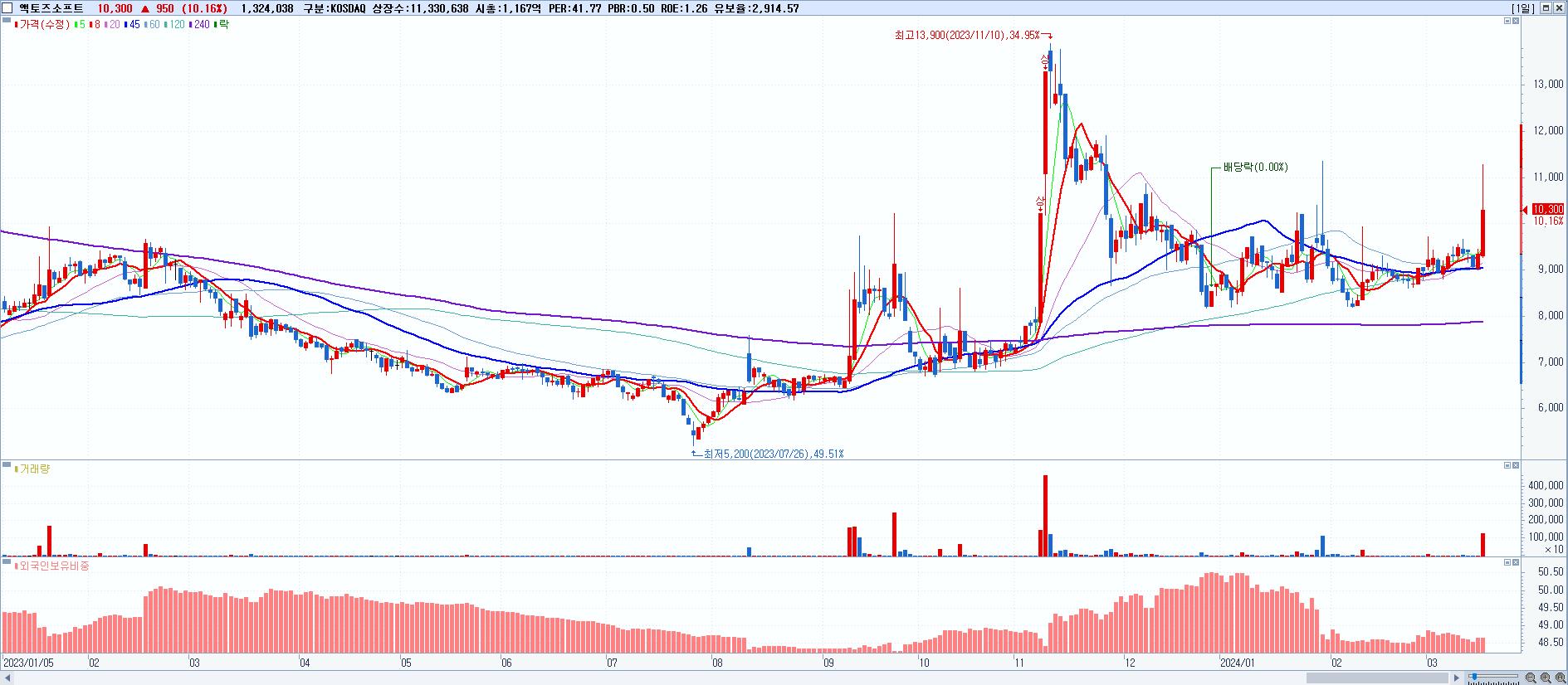 - 액토즈소프트 (10,300원 ▲ 10.16% , 시총: 1,167억, 거래량: 1,324,038, 거래대금:139억)