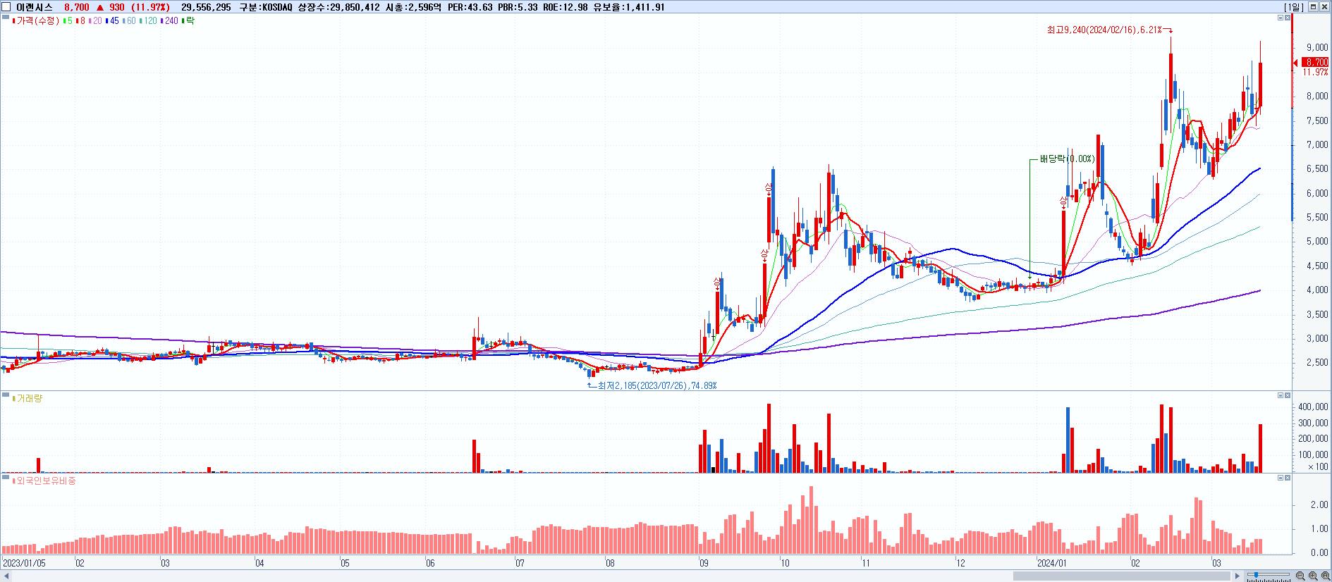 - 이랜시스 (8,700원 ▲ 11.97% , 시총: 2,597억, 거래량: 29,556,295, 거래대금:2,567억)