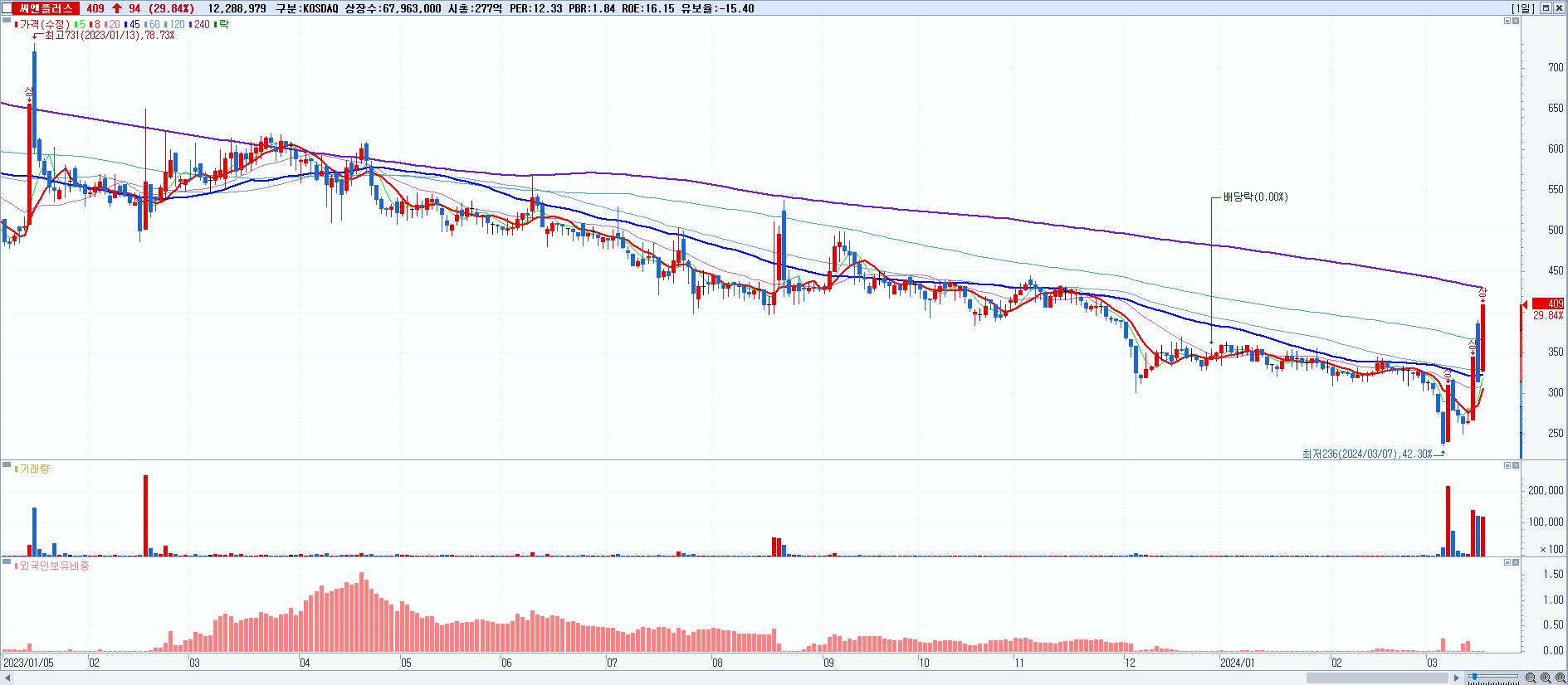 - 씨엔플러스 (409원 ▲ 29.84% , 시총: 278억, 거래량: 12,288,979, 거래대금:49억)