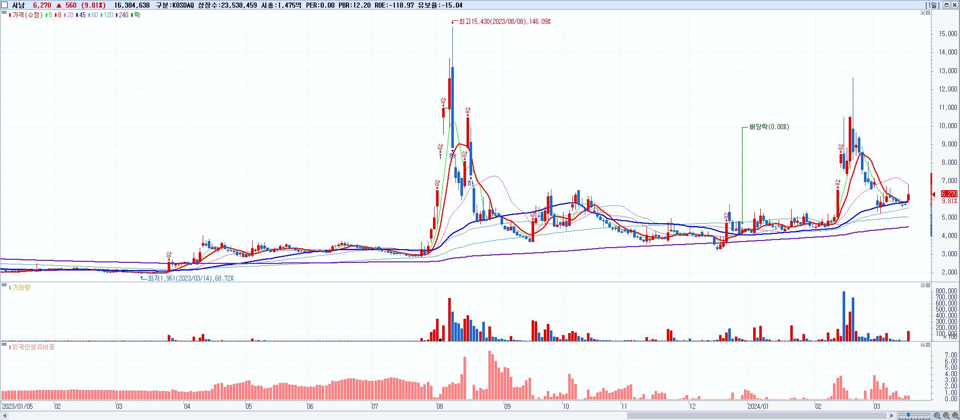 - 서남 (6,270원 ▲ 9.81% , 시총: 1,476억, 거래량: 16,384,638, 거래대금:1,043억)