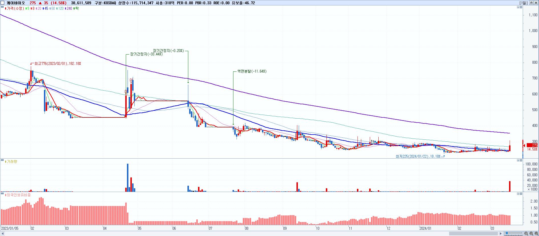 - 케이바이오 (275원 ▲ 14.58% , 시총: 318억, 거래량: 38,611,589, 거래대금:111억)