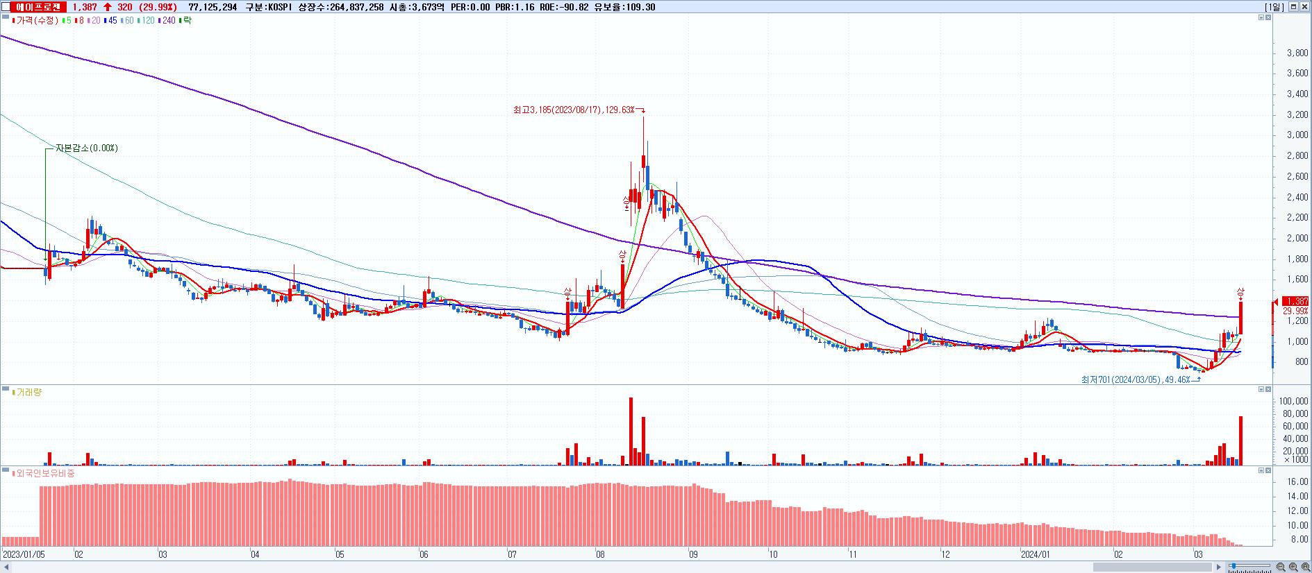시총: 3,673억 거래량: 77,125,294 거래대금:985억