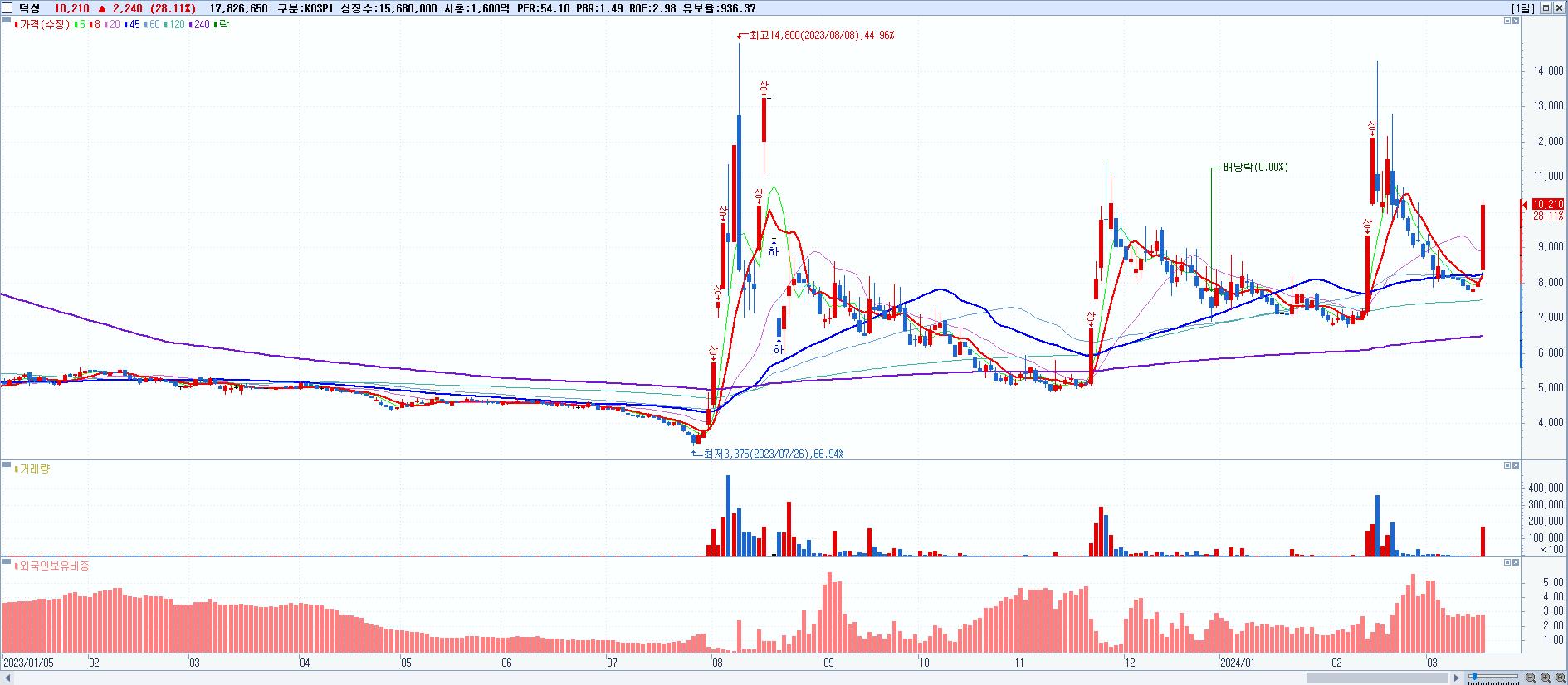 - 덕성 (10,210원 ▲ 28.11% , 시총: 1,601억, 거래량: 17,826,650, 거래대금:1,742억)