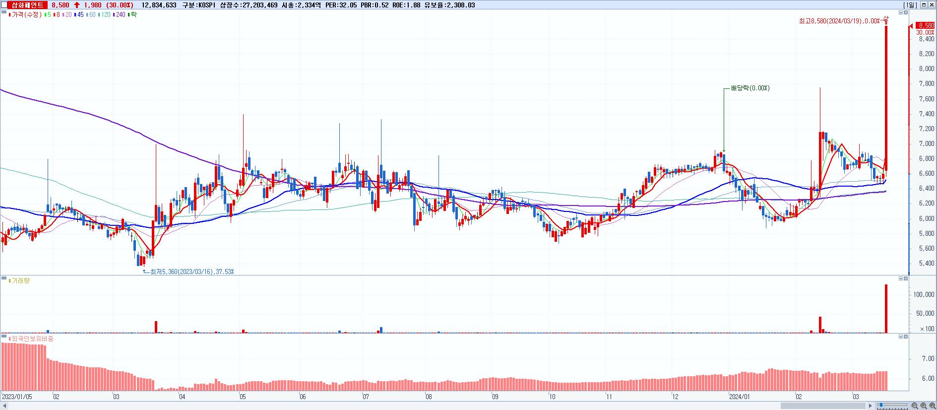 1.삼화페인트 8,580원 ▲ 30% (KOSPI, 000390)