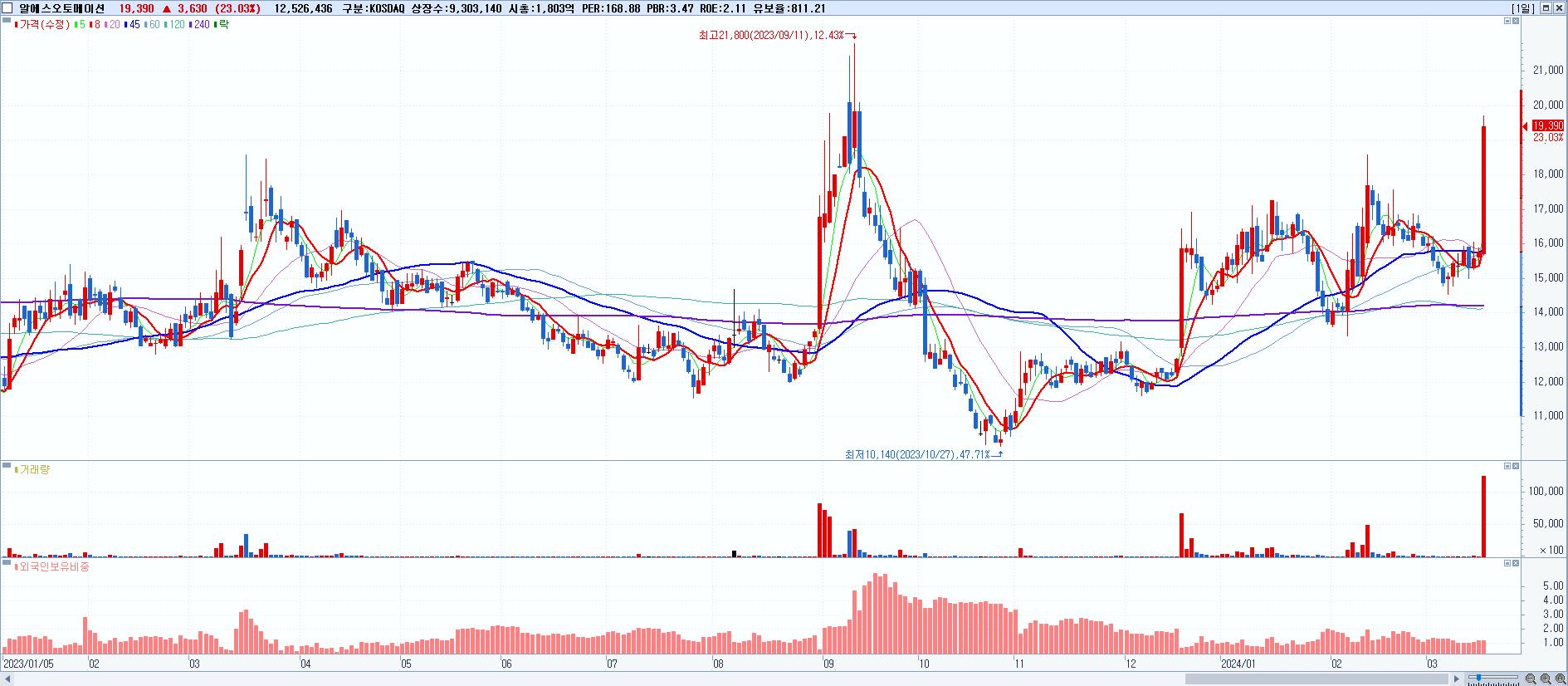 - 알에스오토메이션 (19,390원 ▲ 23.03% , 시총: 1,804억, 거래량: 12,526,436, 거래대금:2,340억)