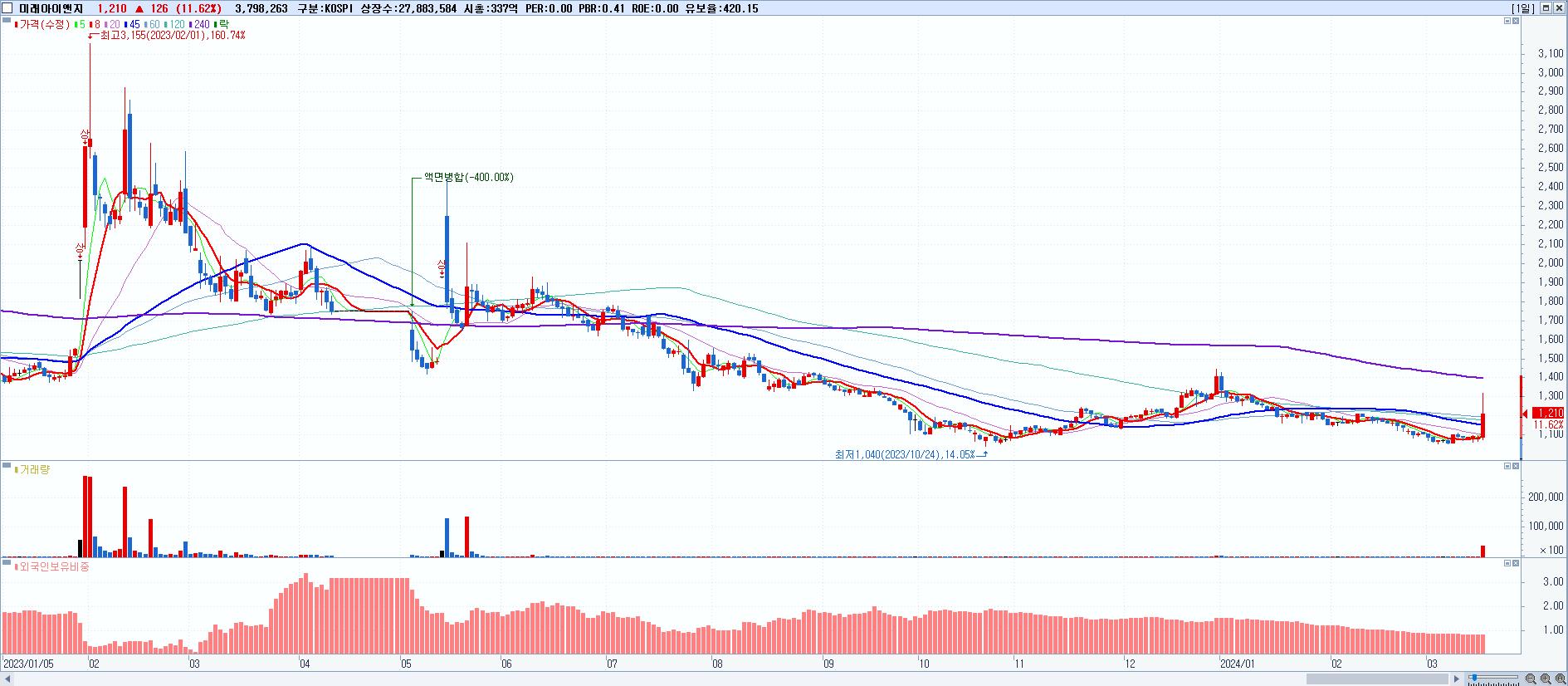 - 미래아이앤지 (1,210원 ▲ 11.62% , 시총: 337억, 거래량: 3,798,263, 거래대금:46억)