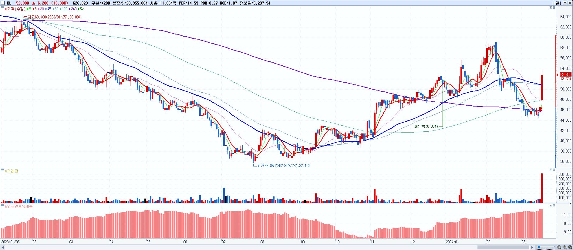 - DL (52,800원 ▲ 13.3% , 시총: 11,065억, 거래량: 626,823, 거래대금:326억)