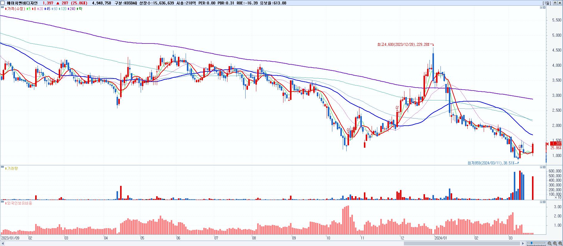 - 에이치앤비디자인 (1,397원 ▲ 25.86% , 시총: 218억, 거래량: 4,948,758, 거래대금:62억)