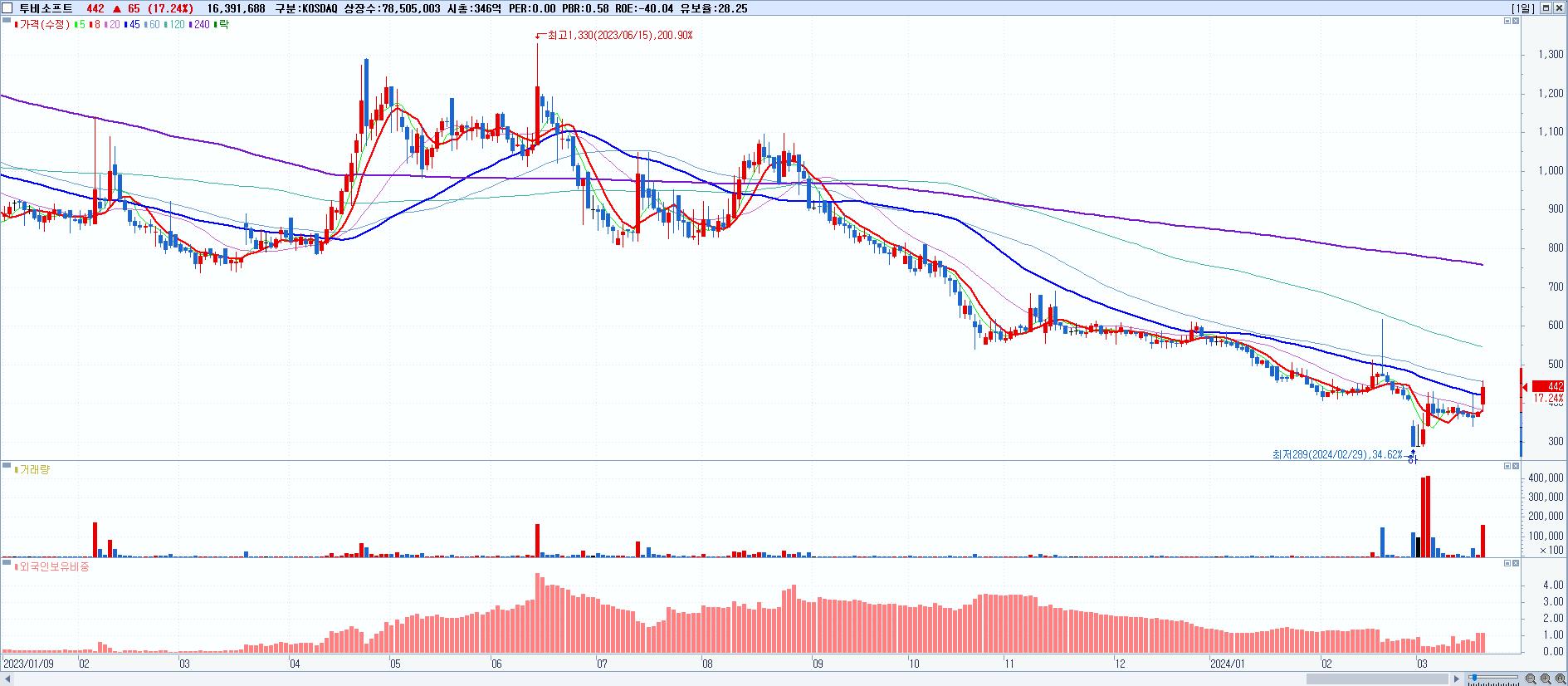 - 투비소프트 (442원 ▲ 17.24% , 시총: 347억, 거래량: 16,391,688, 거래대금:70억)