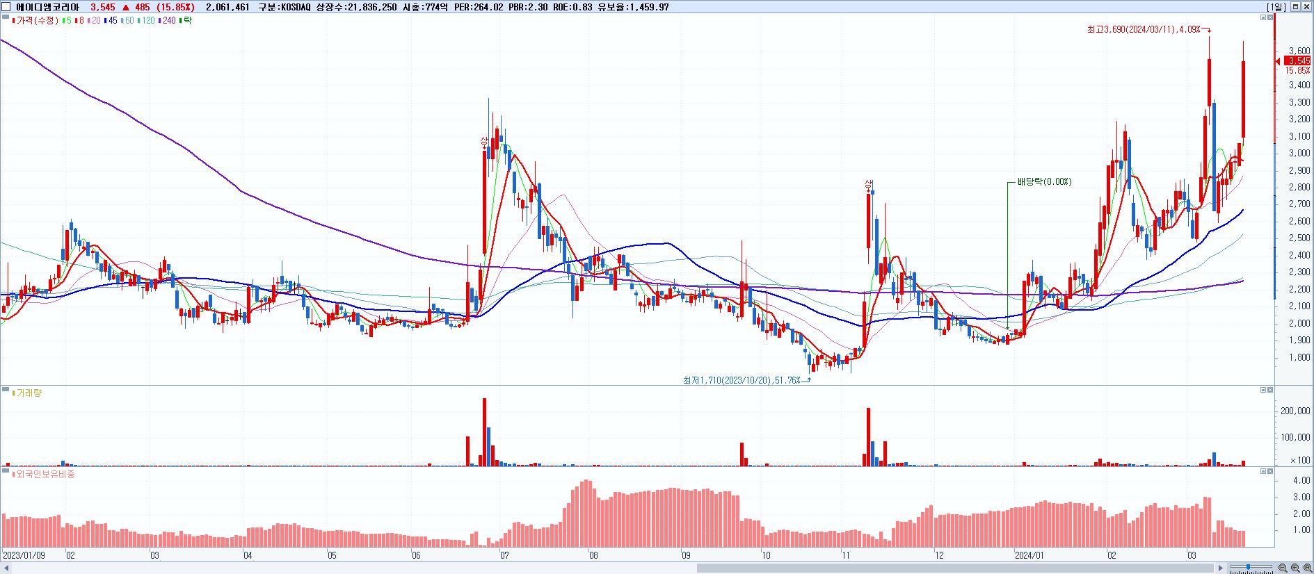 - 에이디엠코리아 (3,545원 ▲ 15.85% , 시총: 774억, 거래량: 2,061,461, 거래대금:71억)