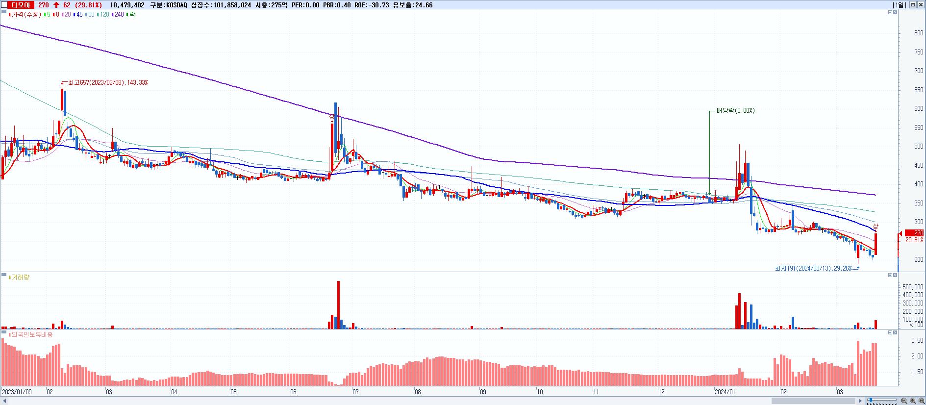 - 디모아 (270원 ▲ 29.81% , 시총: 275억, 거래량: 10,479,402, 거래대금:28억)