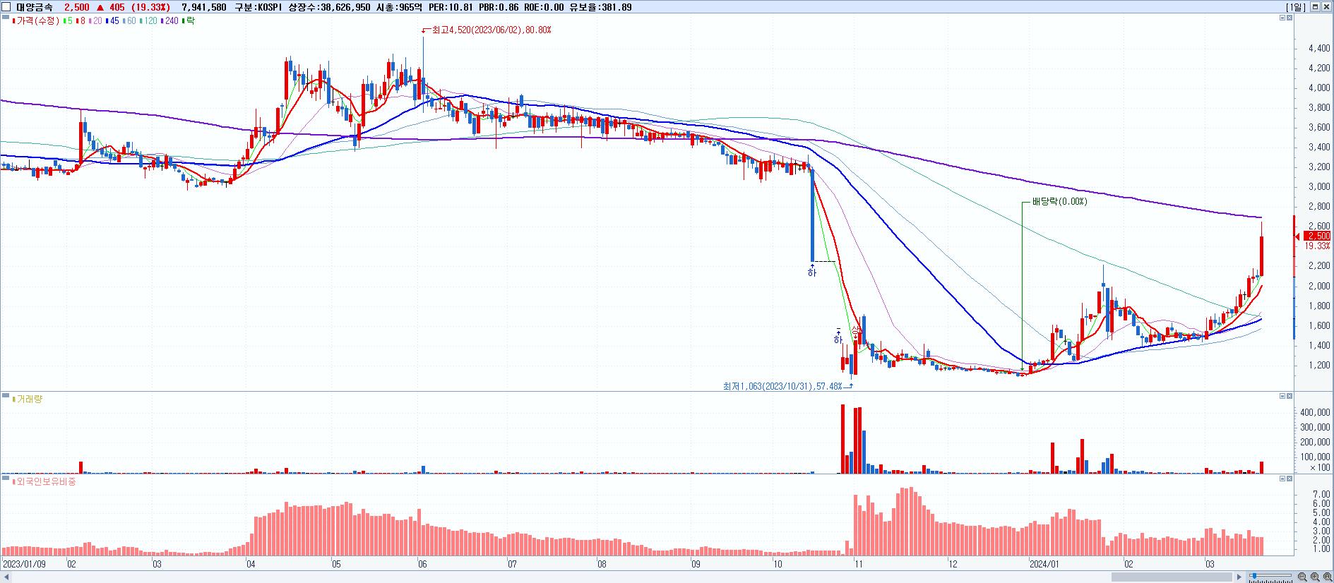 - 대양금속 (2,500원 ▲ 19.33% , 시총: 966억, 거래량: 7,941,580, 거래대금:195억)