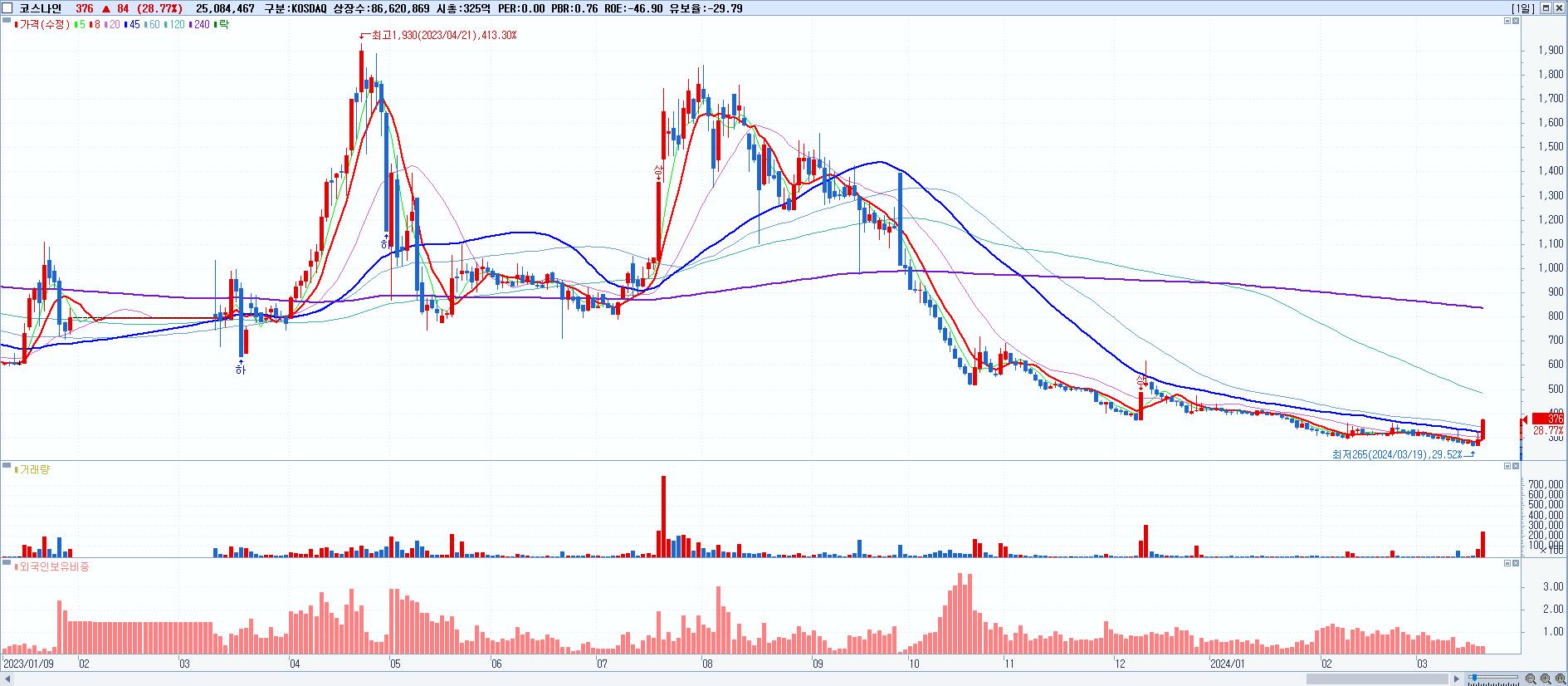 - 코스나인 (376원 ▲ 28.77% , 시총: 326억, 거래량: 25,084,467, 거래대금:89억)
