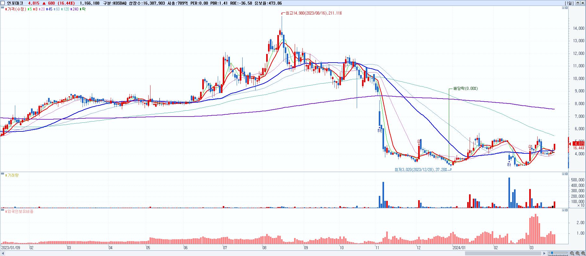 - 인포마크 (4,815원 ▲ 16.44% , 시총: 789억, 거래량: 1,166,188, 거래대금:54억)
