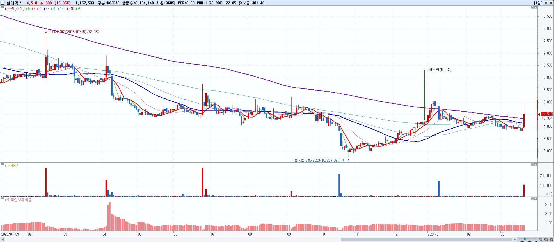 - 셀레믹스 (4,510원 ▲ 15.35% , 시총: 368억, 거래량: 1,157,533, 거래대금:54억)