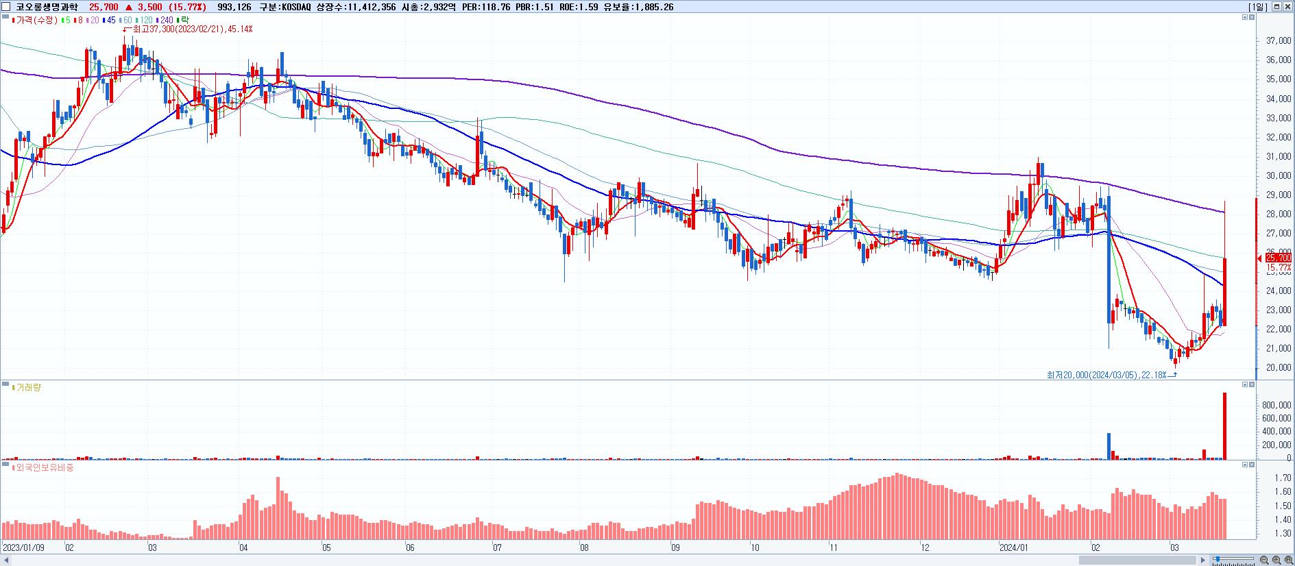 - 코오롱생명과학 (25,700원 ▲ 15.77% , 시총: 2,933억, 거래량: 993,126, 거래대금:263억)