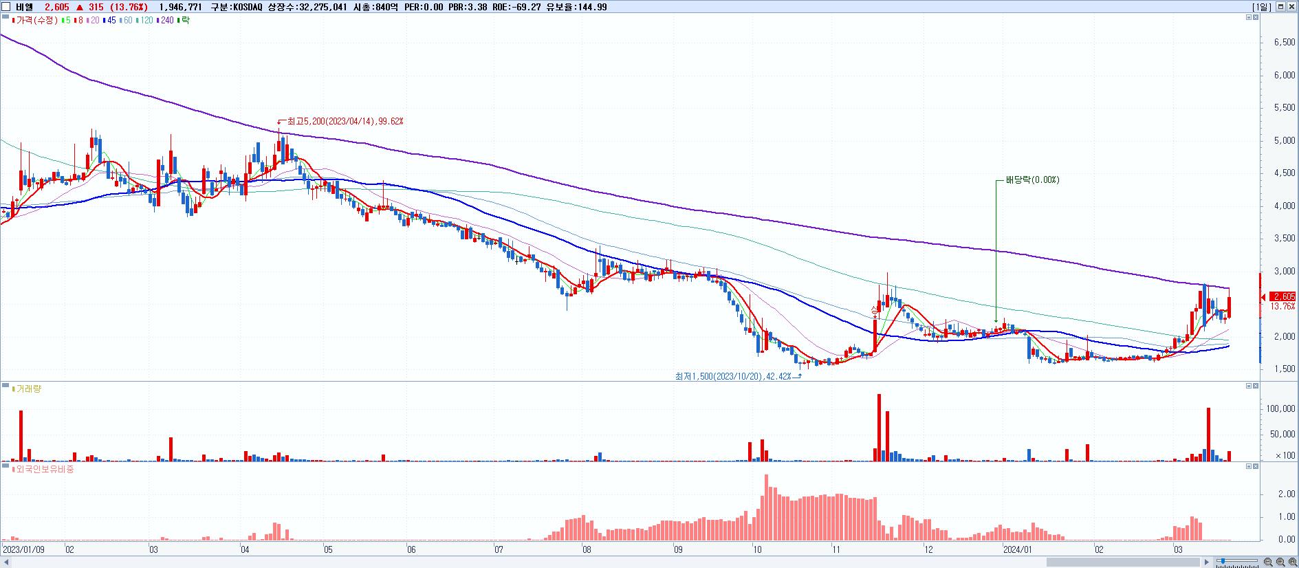 - 비엘 (2,605원 ▲ 13.76% , 시총: 841억, 거래량: 1,946,771, 거래대금:50억)