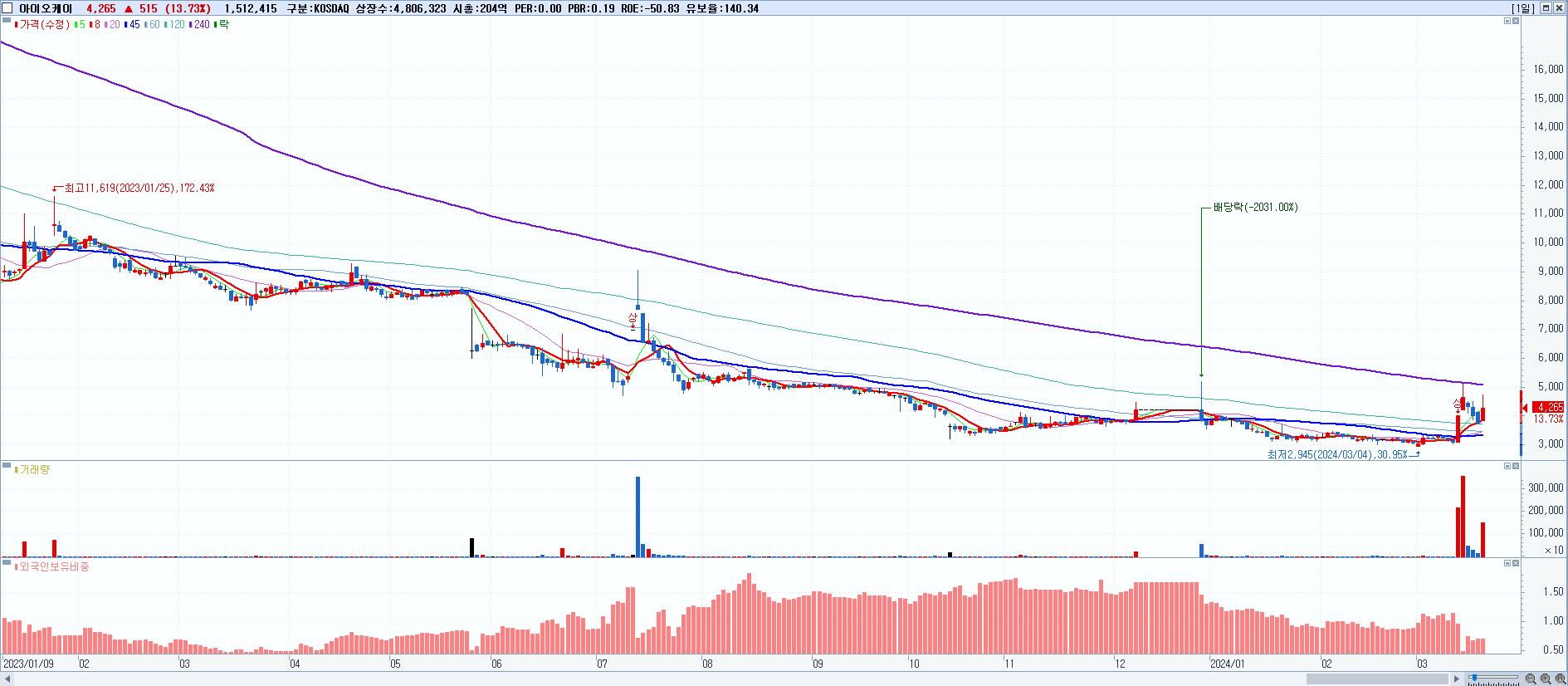 - 아이오케이 (4,265원 ▲ 13.73% , 시총: 205억, 거래량: 1,512,415, 거래대금:67억)