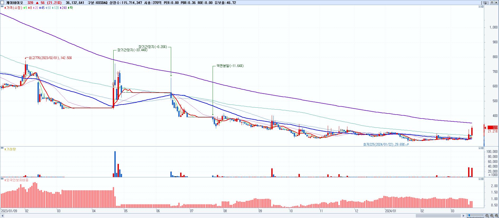 - 케이바이오 (320원 ▲ 21.21% , 시총: 370억, 거래량: 36,132,641, 거래대금:112억)