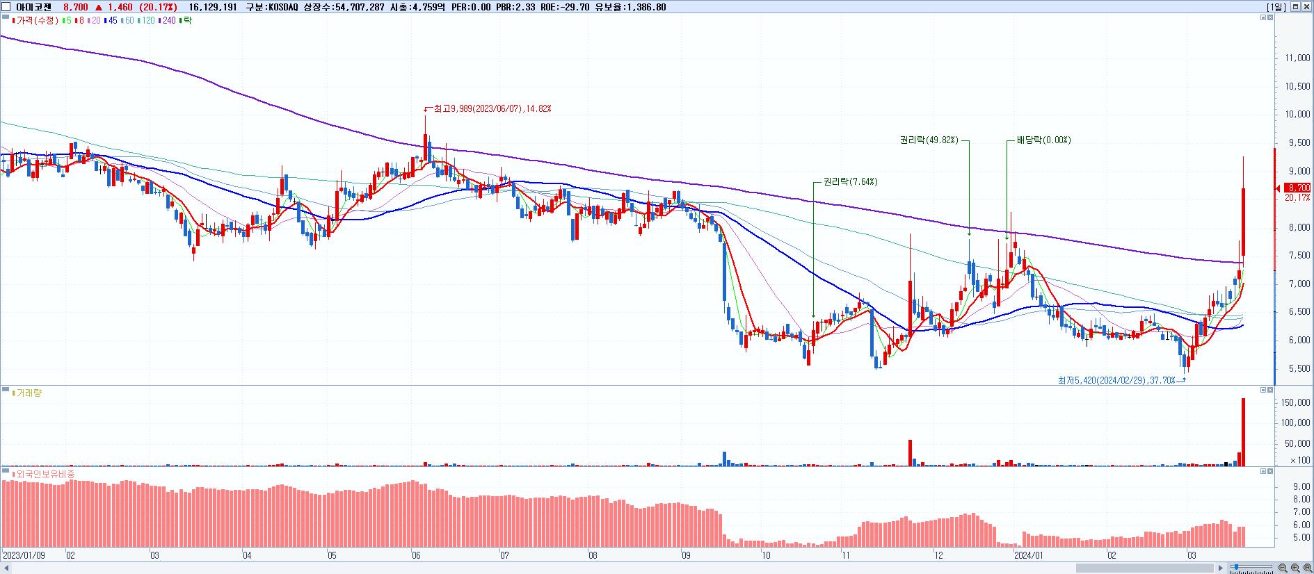 - 아미코젠 (8,700원 ▲ 20.17% , 시총: 4,760억, 거래량: 16,129,191, 거래대금:1,375억)