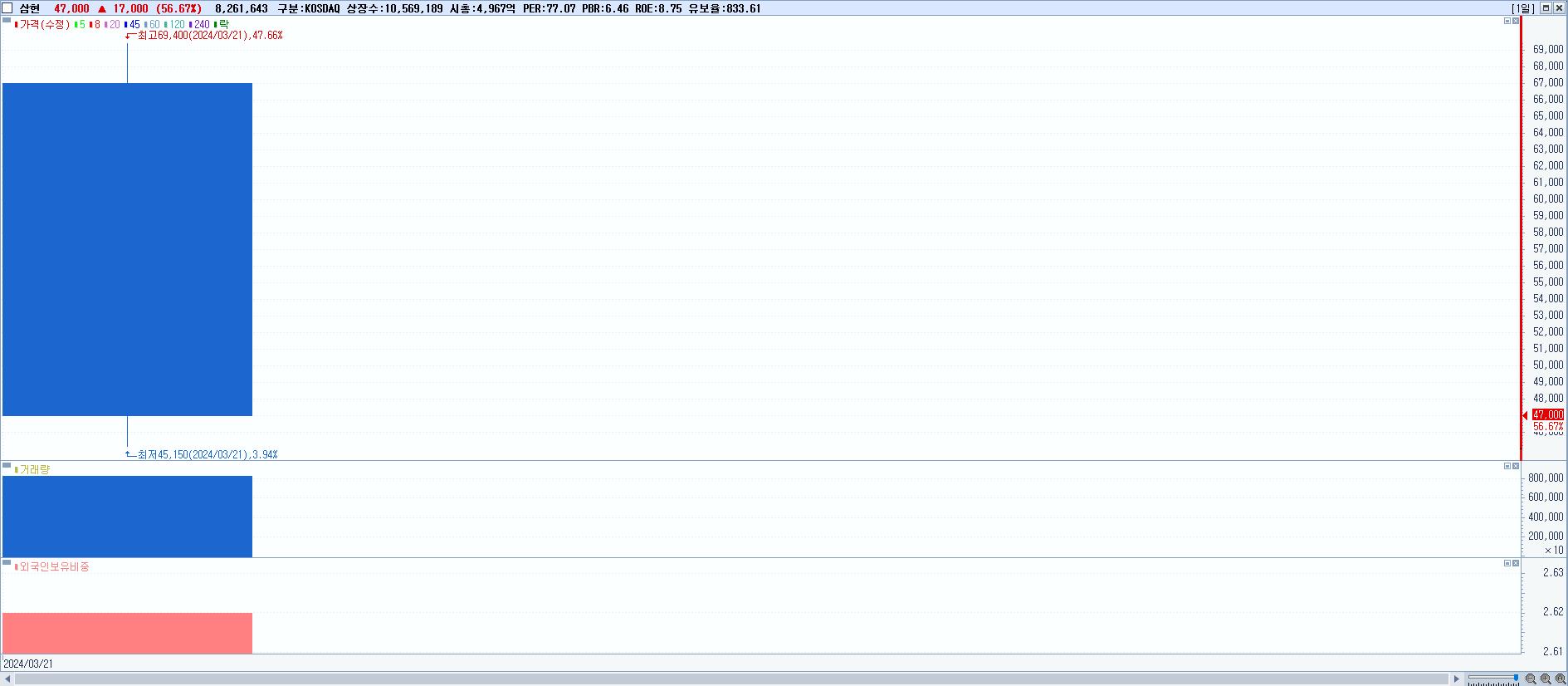 - 삼현 (47,000원 ▲ 56.67% , 시총: 4,968억, 거래량: 8,261,643, 거래대금:4,612억)