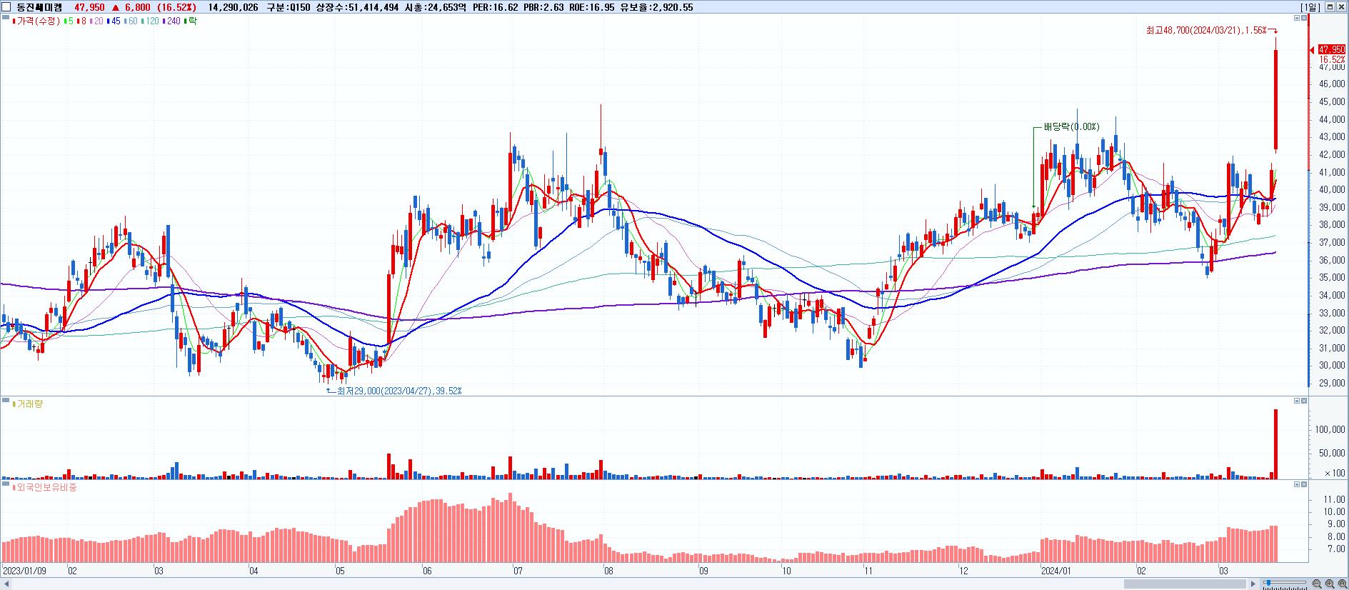 - 동진쎄미켐 (47,950원 ▲ 16.52% , 시총: 24,653억, 거래량: 14,290,026, 거래대금:6,604억)