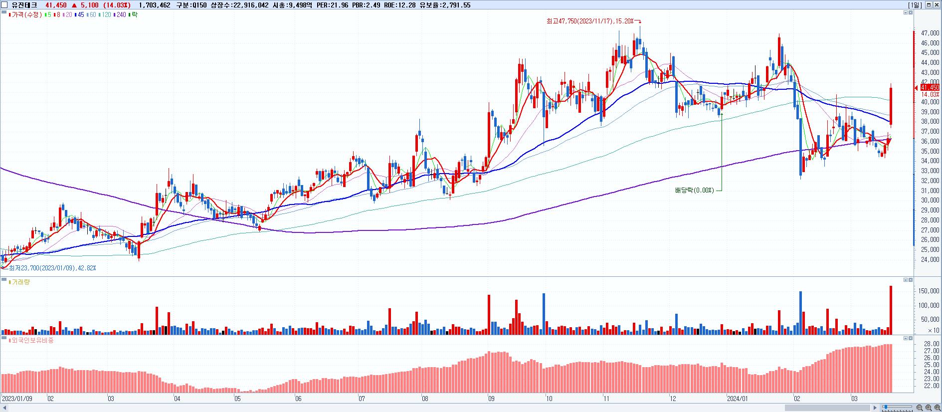 - 유진테크 (41,450원 ▲ 14.03% , 시총: 9,499억, 거래량: 1,703,462, 거래대금:686억)