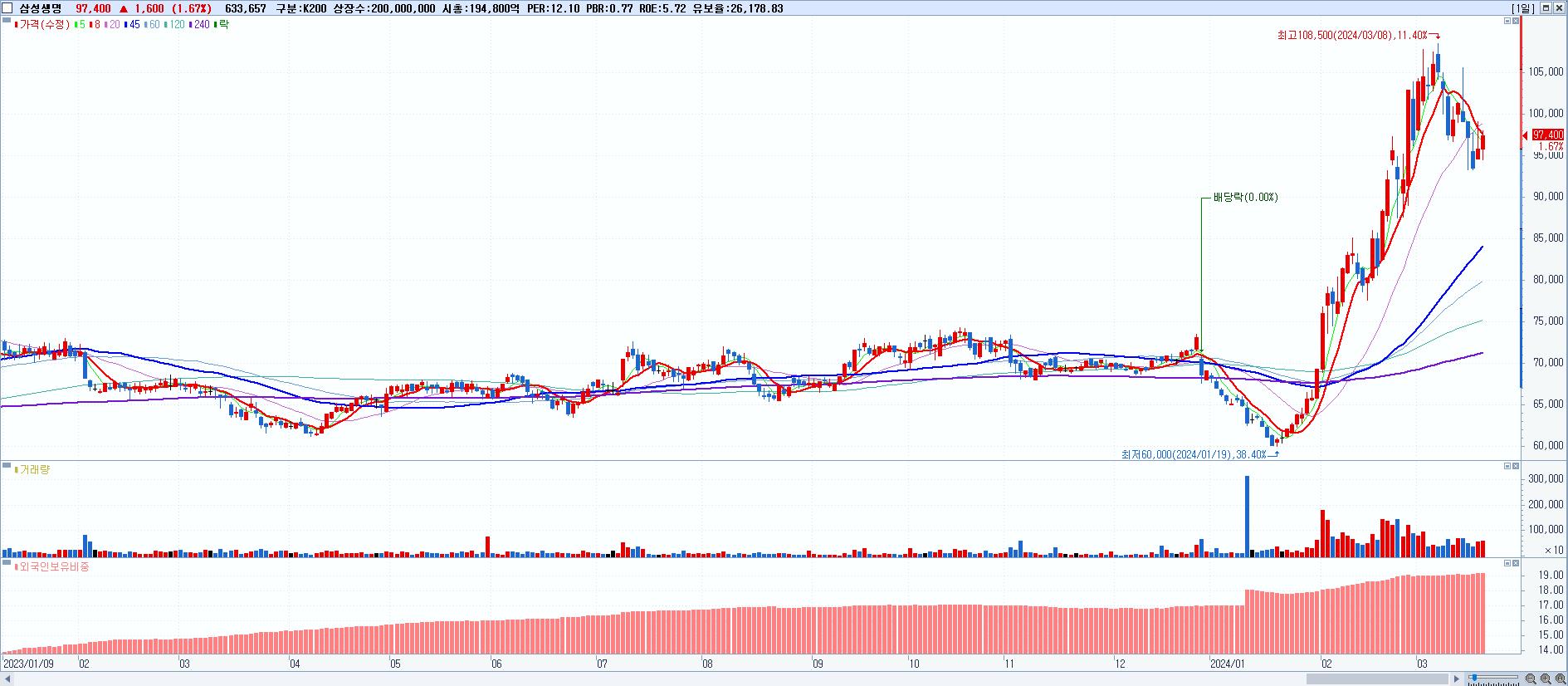 - 삼성생명 (97,400원 ▲ 1.67% , 시총: 194,800억, 외국인 순매수 거래금:132억)