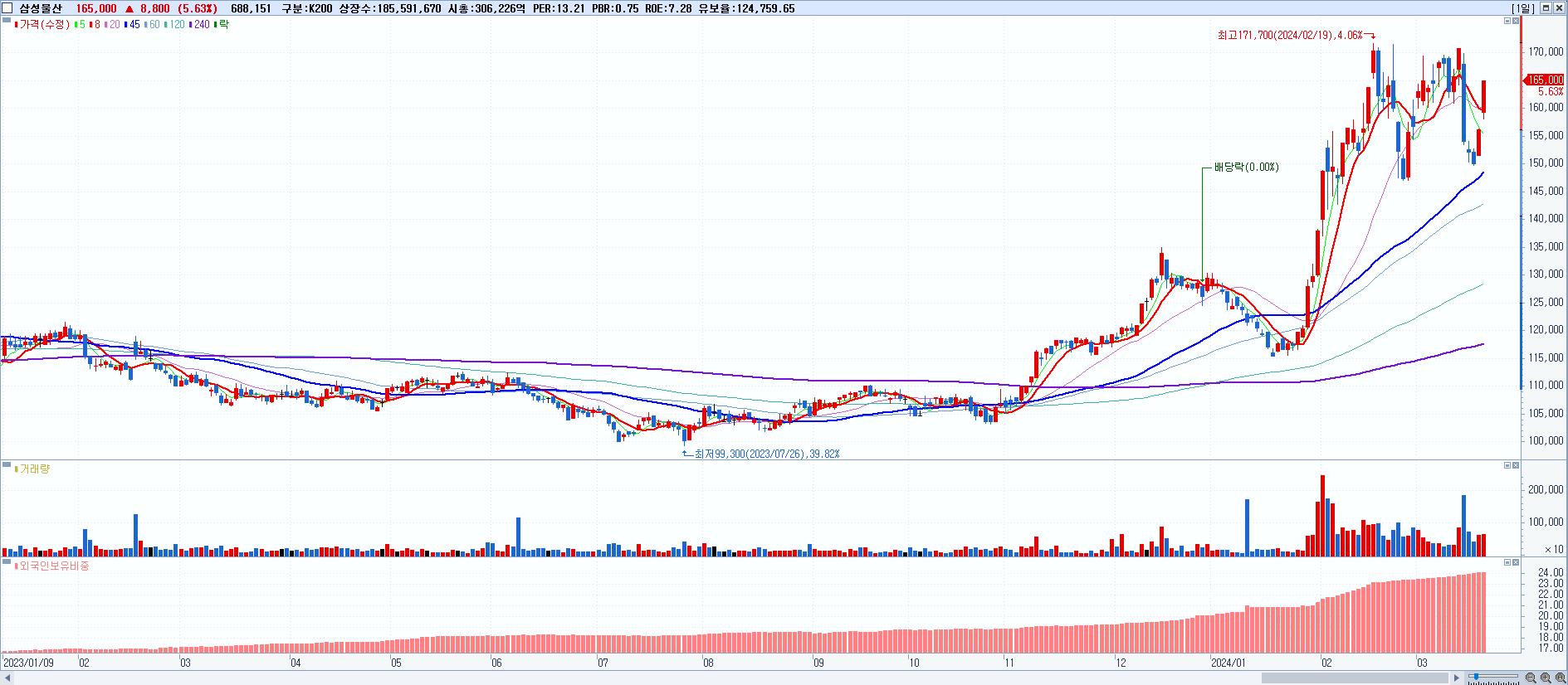 - 삼성물산 (165,000원 ▲ 5.63% , 시총: 306,226억, 외국인 순매수 거래금:318억)